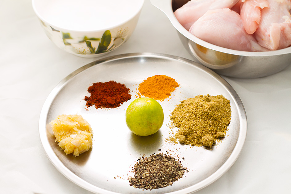 Wash and cut chicken into bite size pieces and marinade it in yogurt, ginger and garlic paste, coriander powder, pepper powder, Red Chile powder, turmeric, 1 Tsp salt and lime juice. Keep the marinated chicken on table top for about an hour.